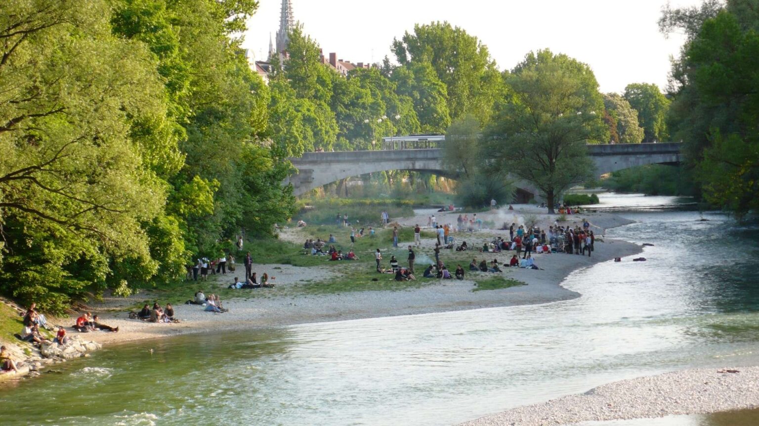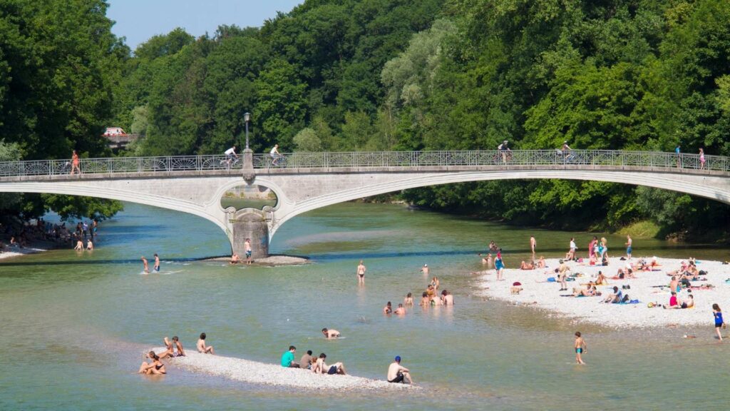 Die Praterinsel gehört zu den beliebtesten innerstädtischen Badeplätzen an der Isar. Direkt am Fluss finden sich idyllische Liegewiesen und kieselige Strände, die an heißen Sommertagen viele Besucher anlocken. Münchnerinnen und Münchner legen sich am Isarufer der Insel in die Sonne oder kühlen sich im klaren Wasser ab. Kleine Wehrstufen erzeugen hier sogar malerische Mini-Wasserfälle, und bei nur leichter bis mittlerer Strömung lässt es sich in diesem Bereich hervorragend schwimmen. Allerdings gibt es kaum schattige Plätze auf der offenen Insel – an sehr sonnigen Tagen heißt es also früh kommen, um ein schönes Plätzchen am Ufer zu ergattern.